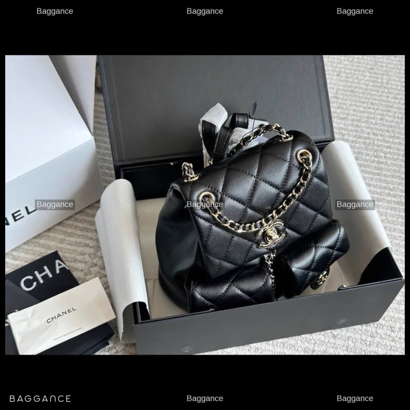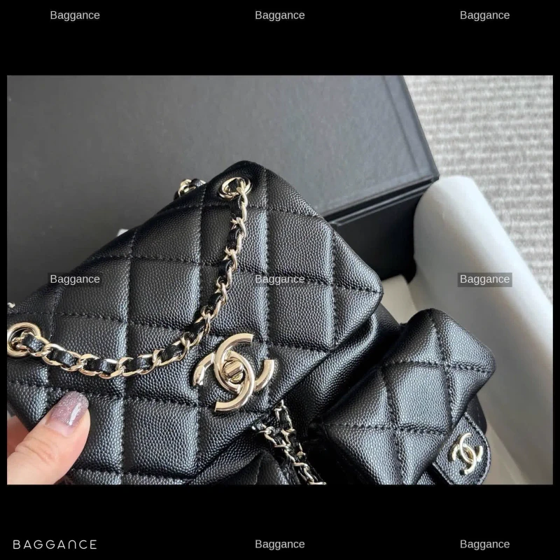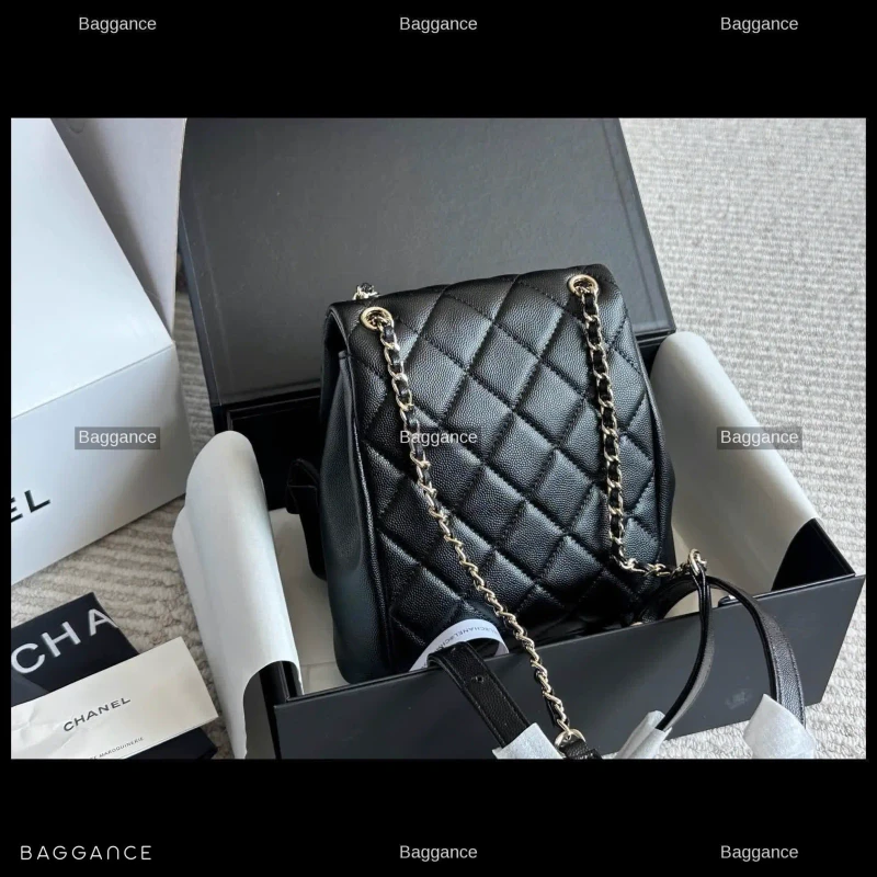 This exquisite backpack is crafted from high-quality suede leather, providing a soft-touch texture that radiates luxury and sophistication. The deep black hue is perfectly complemented by polished gold-tone hardware, including the signature interlocking CC turn-lock and chain-link accents. The durable construction ensures the bag maintains its structured yet supple shape over time.