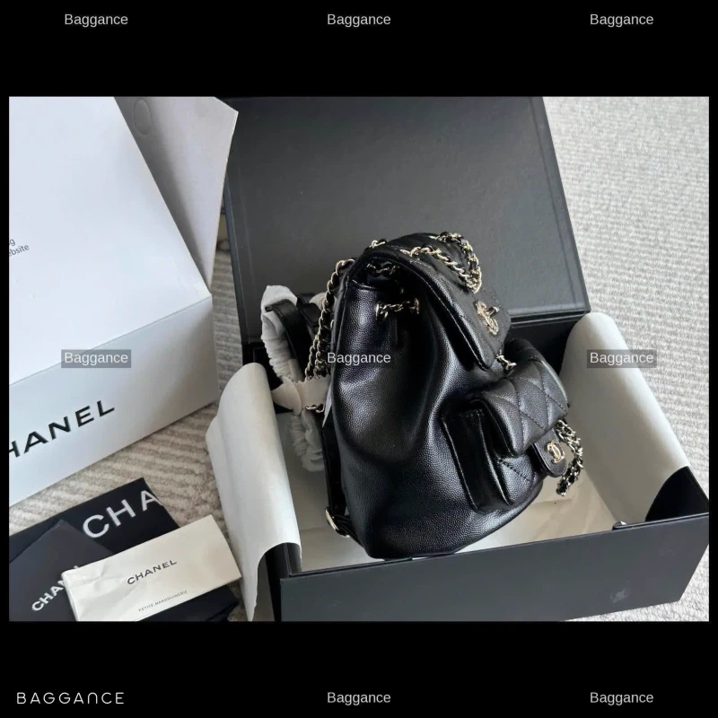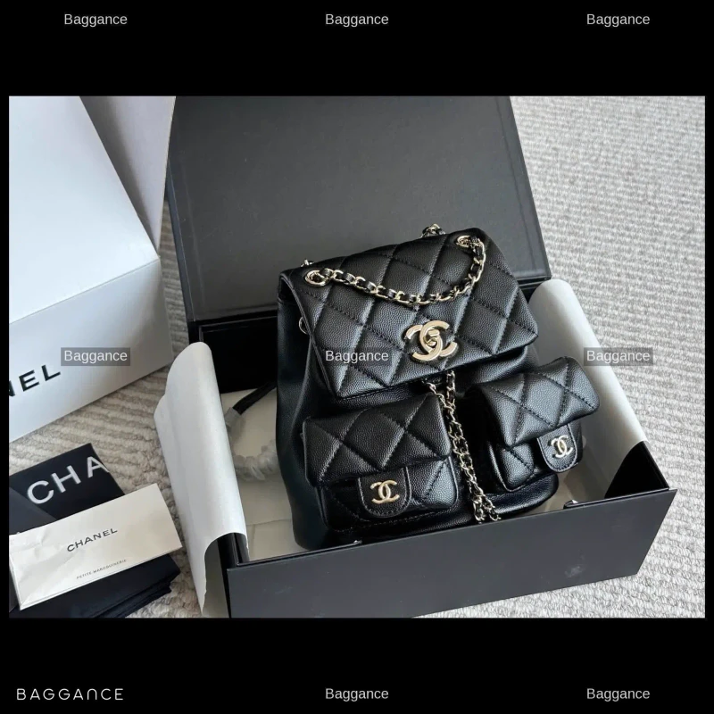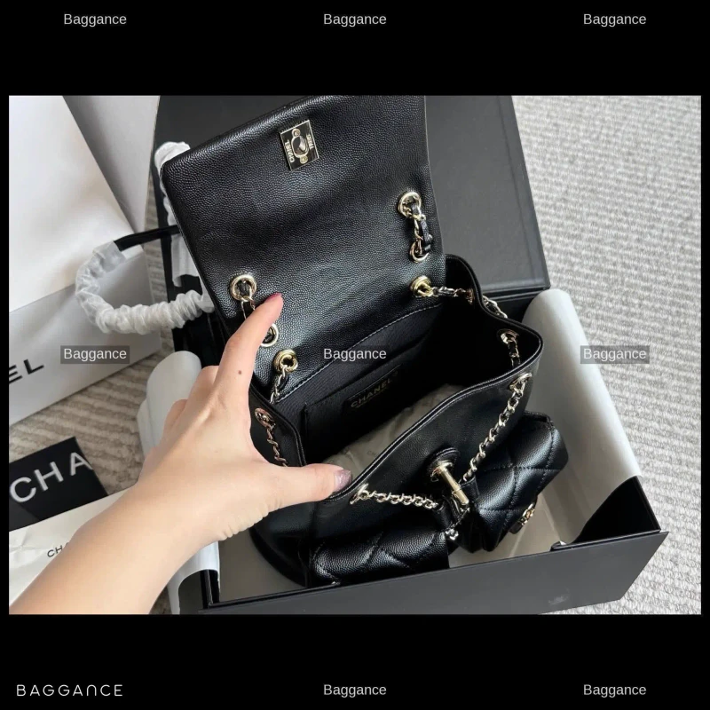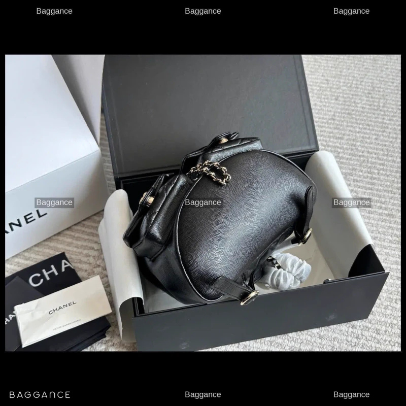 The Chanel Duma Mini Backpack is a standout piece for the current season, blending the iconic elegance of the French luxury house with a playful, modern silhouette. Often referred to as the 'little frog' backpack due to its unique flap and pocket arrangement, this black edition is the perfect accessory for those seeking both functionality and high-fashion appeal.